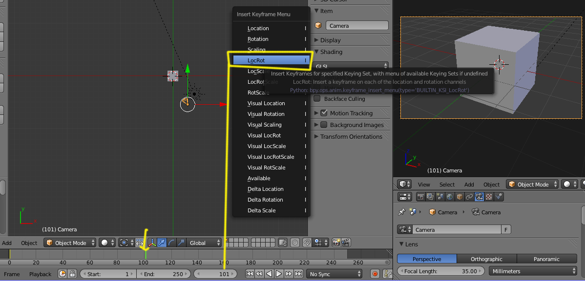 Seleccionas la cámara y presionas letra i y la opción LocRot estando en el frame 1 (por ejemplo)