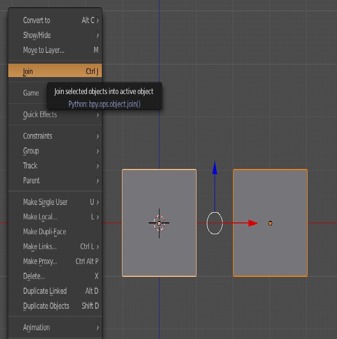 Para unir dos objetos en uno es CTRL+J, con la configuración por defecto.