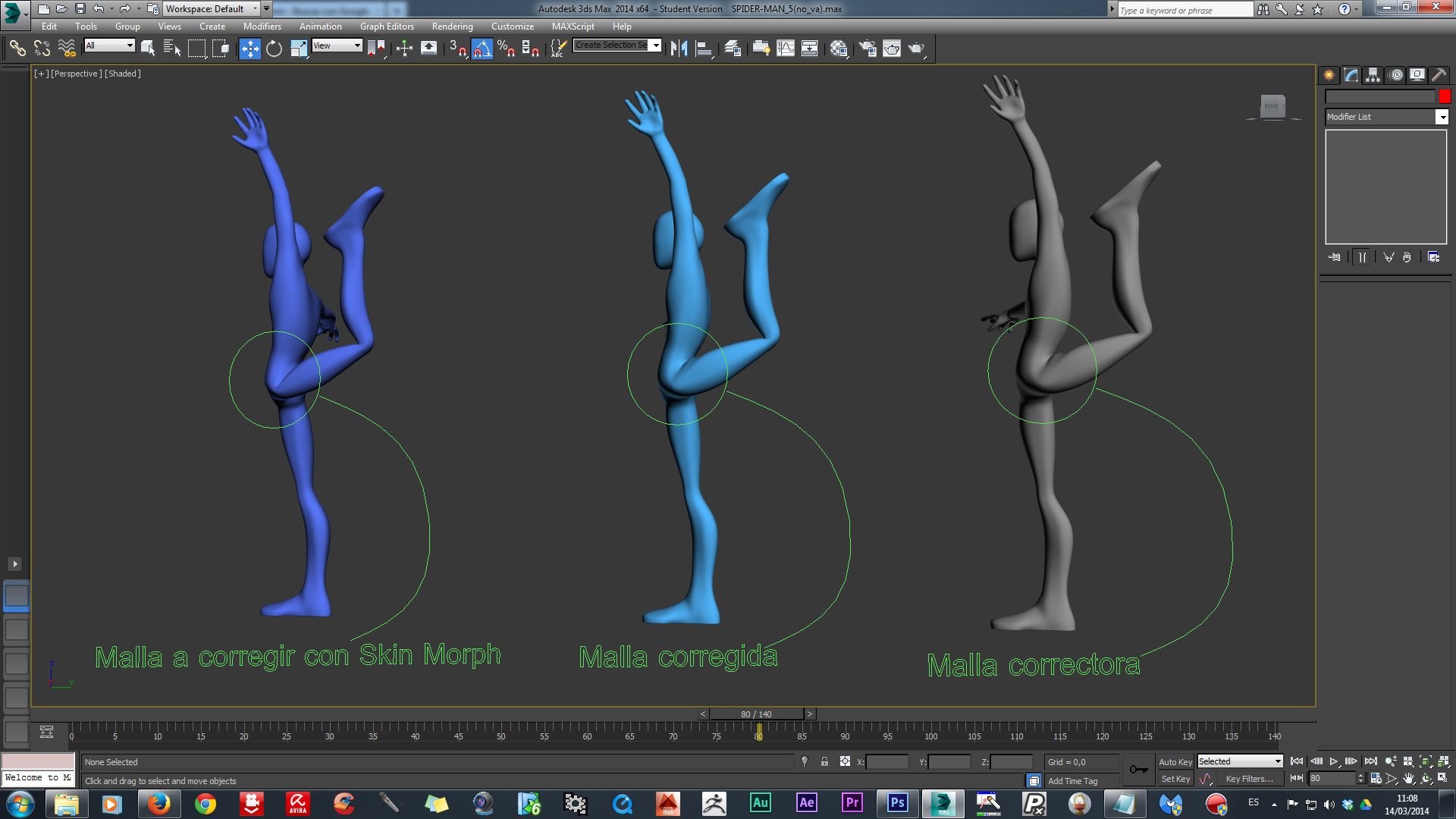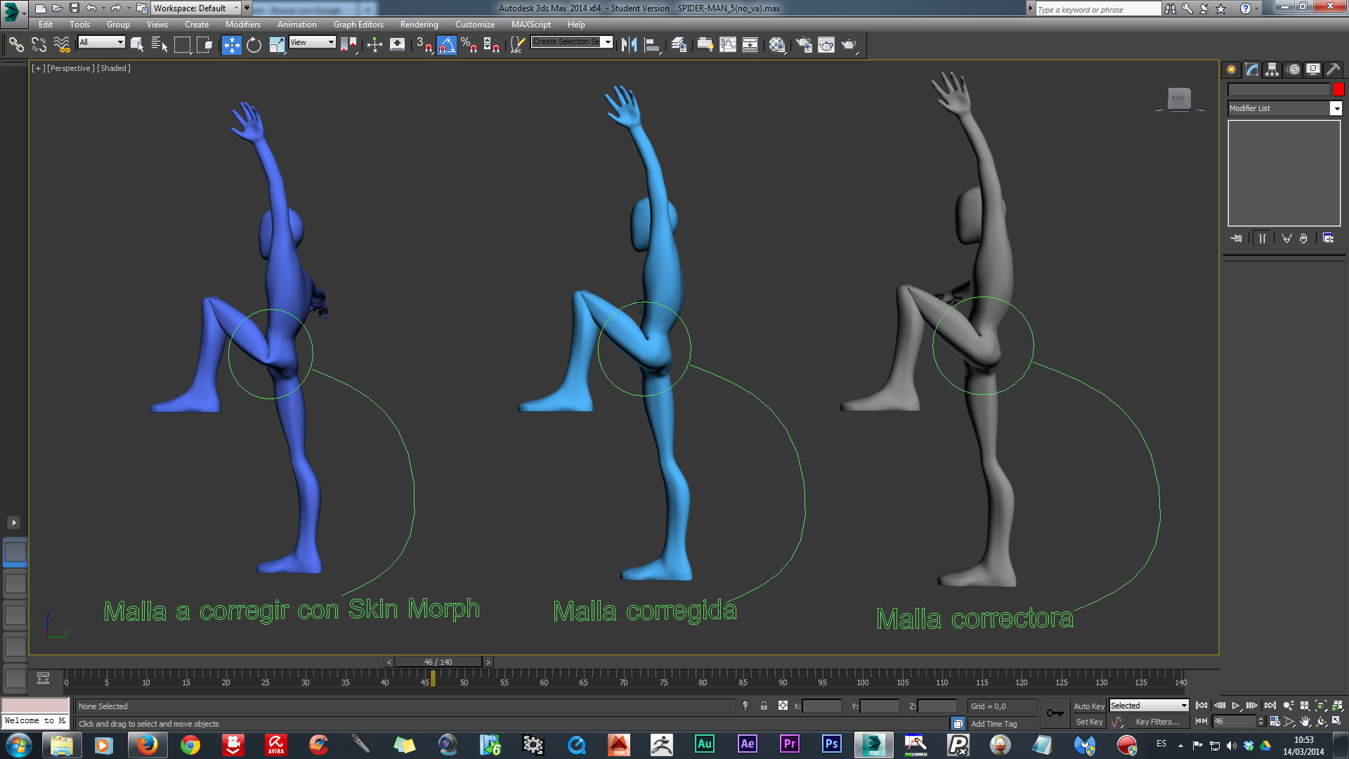 Entonces, vamos a suponer que tengo un modelo que debería ser casi un contorsionista, debería posicionarlo en posturas extremas y con Skin Morph corregirlas, ya bien sea con mallas auxiliares o retocando puntos, que también se puede, pero me surgen 2 problemas: