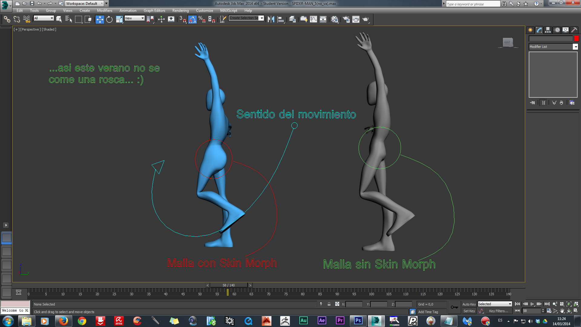 Bueno he probado a bajar el influence angle y tarda más en dispararse el Morph, para la última pose, he tenido que bajarlo hasta el 1,0 y, funciona, con lo cual IkerClon, si me paso por Los Ángeles, te llevo un buen chorizo de Salamanca o un quesito de Idiazabal, que se te va a hacer la boca agua, creo que solo me quedaría una pregunta más, ¿puedo ir añadiendo todos los Morphs que necesite, hasta qué el recorrido sea suave? Es que yo creía que solo se necesitarían un par o tres para cada recorrido, pero para posturas tan extremas como estas, en las que el último morph afecta casi solo en el fotograma final, creo que necesitaría quizá 3 o 4 con influence angle al 1,0, para resolver el final de este recorrido, casi una animación fotograma a fotograma, son teorías mías ¿esta bien pensado esto? Que si se hace así, me lío a hacerlo.