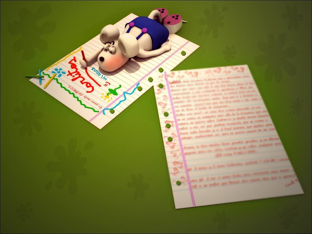 Mejoras por momentos, tío. Me ha gustado mucho, es muy bonita, como de cuento. Tal vez sólo le hubiera dejado el otro folio mirando hacia él, como si lo hubiera escrito ya, y sin el desenfoque. Un saludo.