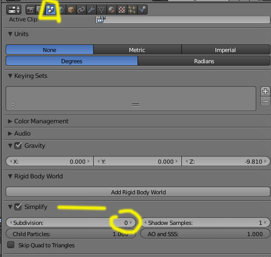 Y si es por cantidad de vértices o subdivisiones, voy a SCENE y activo el SIMPLIFY y le bajo el valor de subdivisiones a cero y las sombras.