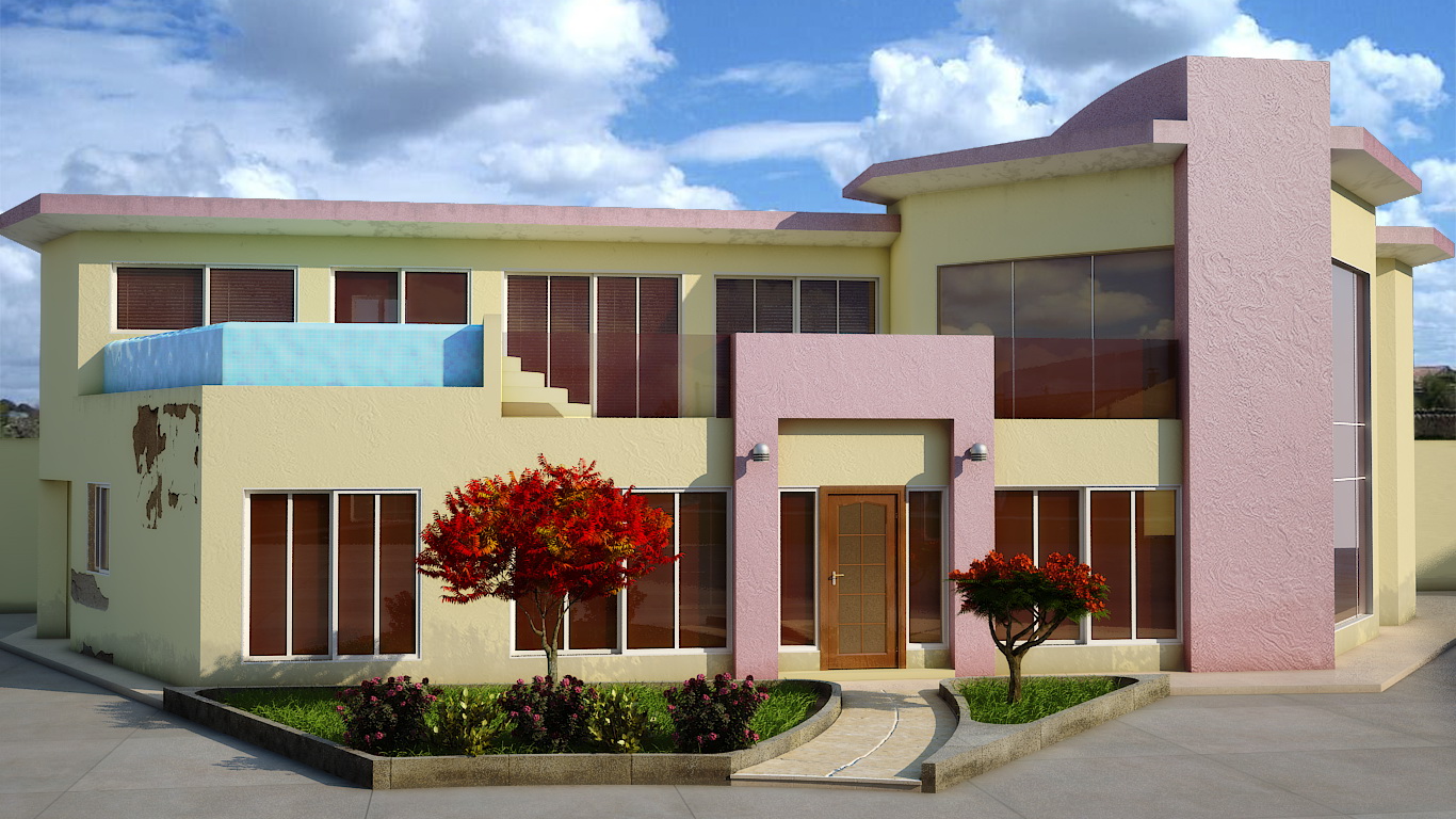 Todas las ventanas se ve que son de aluminio blanco y la puerta de madera con un estilo algo más antiguo. Yo le haría una puerta blanca con una tira al costado de vidrio, algo más moderno y para mí cambiaría mucho. También cambiaría los colores, repito que es solo cuestión de gustos, pero que yo creo que le caería muy bien a la imagen, los colores de las paredes, tal vez un color pastel y algo que lo rompa. En cuanto a la iluminación la pondría más de frente, y la saturaría un poco para qué se vea la sombra por delante de la casa. El pasto y las plantas de abajo me gustan, pero los 2 arbolillos me hacen ruido. A la piscina le daría algo de brillo al agua y un poco más oscuro el revestimiento, para qué resalte, por que apenas se nota qué es una piscina. Me gusta mucho el aspecto que tienen las paredes. Bueno te remarque detalles sobre gustos más que nada. Buen trabajo. Saludos.