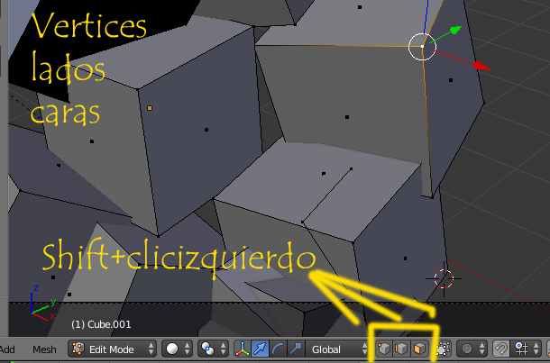 Luego sobre el objeto en modo edición podrás seleccionar o bien vértices, lados o caras, al gusto.