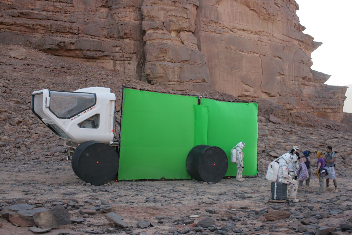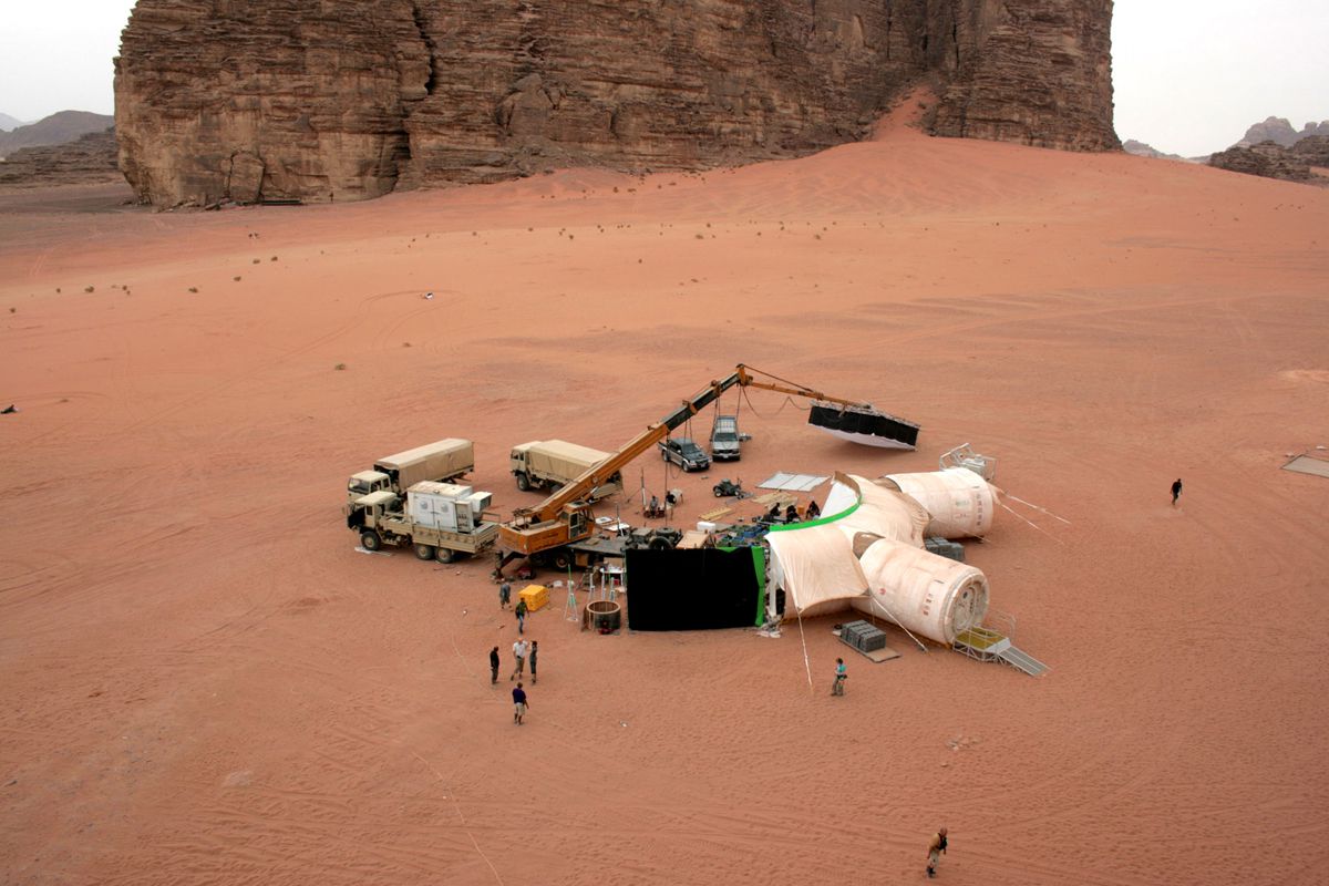 En el set : El paisaje marciano de la película fue tomado a través de la localización en el desierto de Wadi Rum, en Jordania. Aunque se remplazo el cielo y hubo más trabajo digital que se llevo a cabo para la puesta en pantalla de la escena, un requisito adicional e inesperado era eliminar las nuevas torres de energía qué se habían instalado en estas localizaciones.