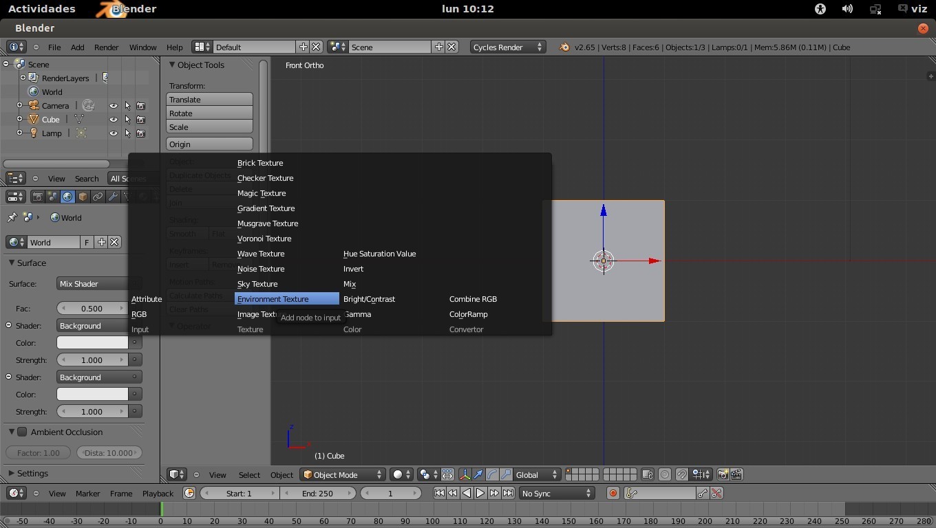 Dentro de Cycles vamos a la opción World y seleccionamos Mix Shader, tenemos dos campos Shader para utilizar, en el primer Shader elegimos la opción Background, en el apartado de Color, vamos a buscar y seleccionar Environment map, ahora ya podemos cargar la imagen correspondiente.
