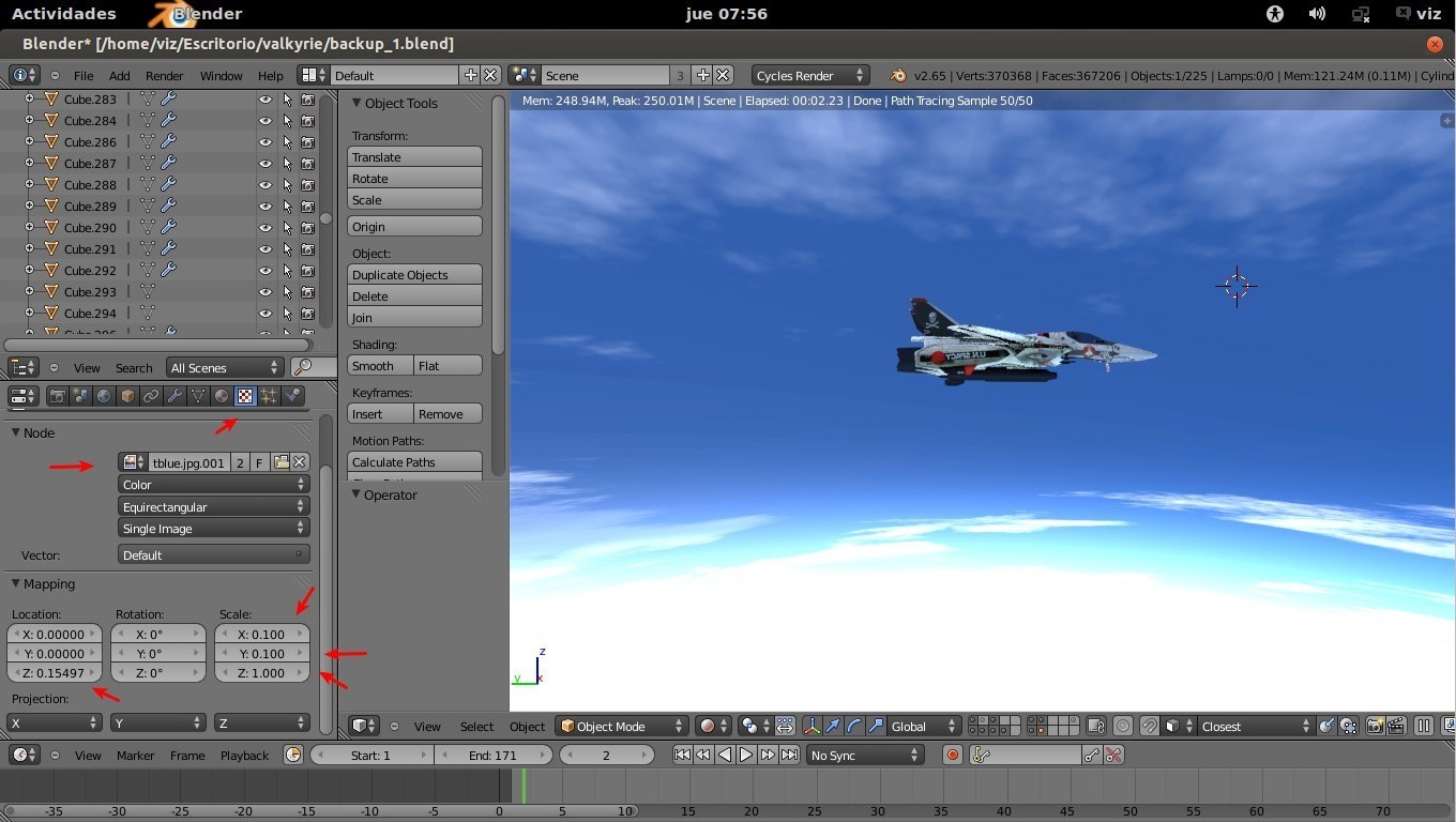 Según el resultado final que busquemos, tenemos que aplanar la esfera sobre el eje Z, para obtener la sensación de que las nubes se desplazar en el horizonte, para conseguir este efecto vamos al parámetro de texturas, buscamos el mapa de fondo y lo vamos moviendo y escalando sobre los distintos ejes.