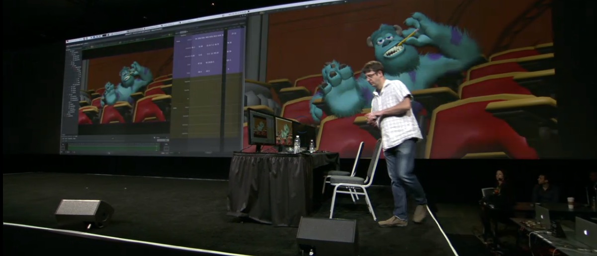 Vrender es un procesador de volumen desarrollado por pizar, y hablan sobre el trabajo que están haciendo con la subdivisión de superficies, específicamente la API OpenSubDiv que utiliza técnicas de triangulación para mostrar de forma interactiva superficies lisas complejas.