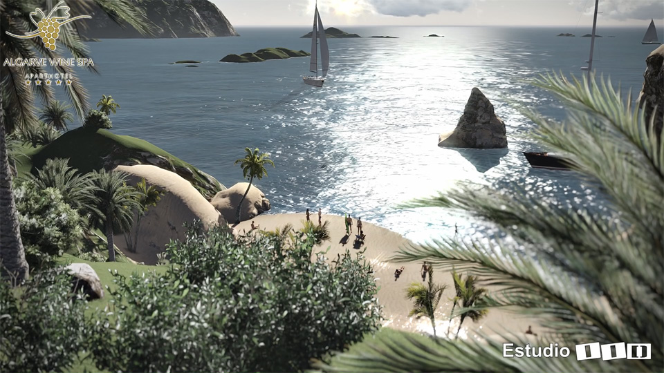 La verdad es que está muy potente, a primera visión me ha chocado el brillo del sol en la superficie de la arena y las mamparas de vidrio de protección de la piscina no me parecen muy conseguidas. Además, las palmeras parecen planas, sin textura.