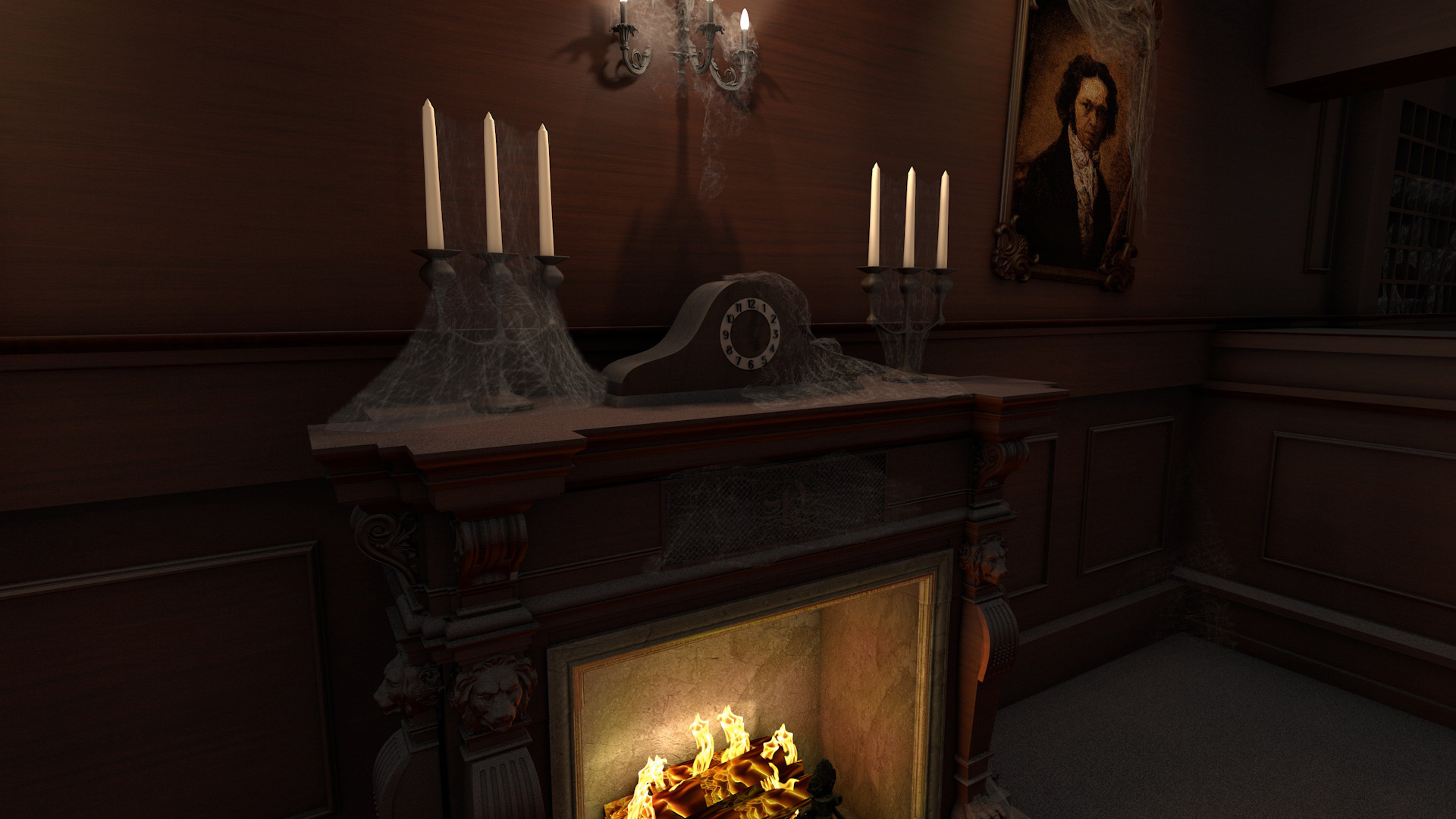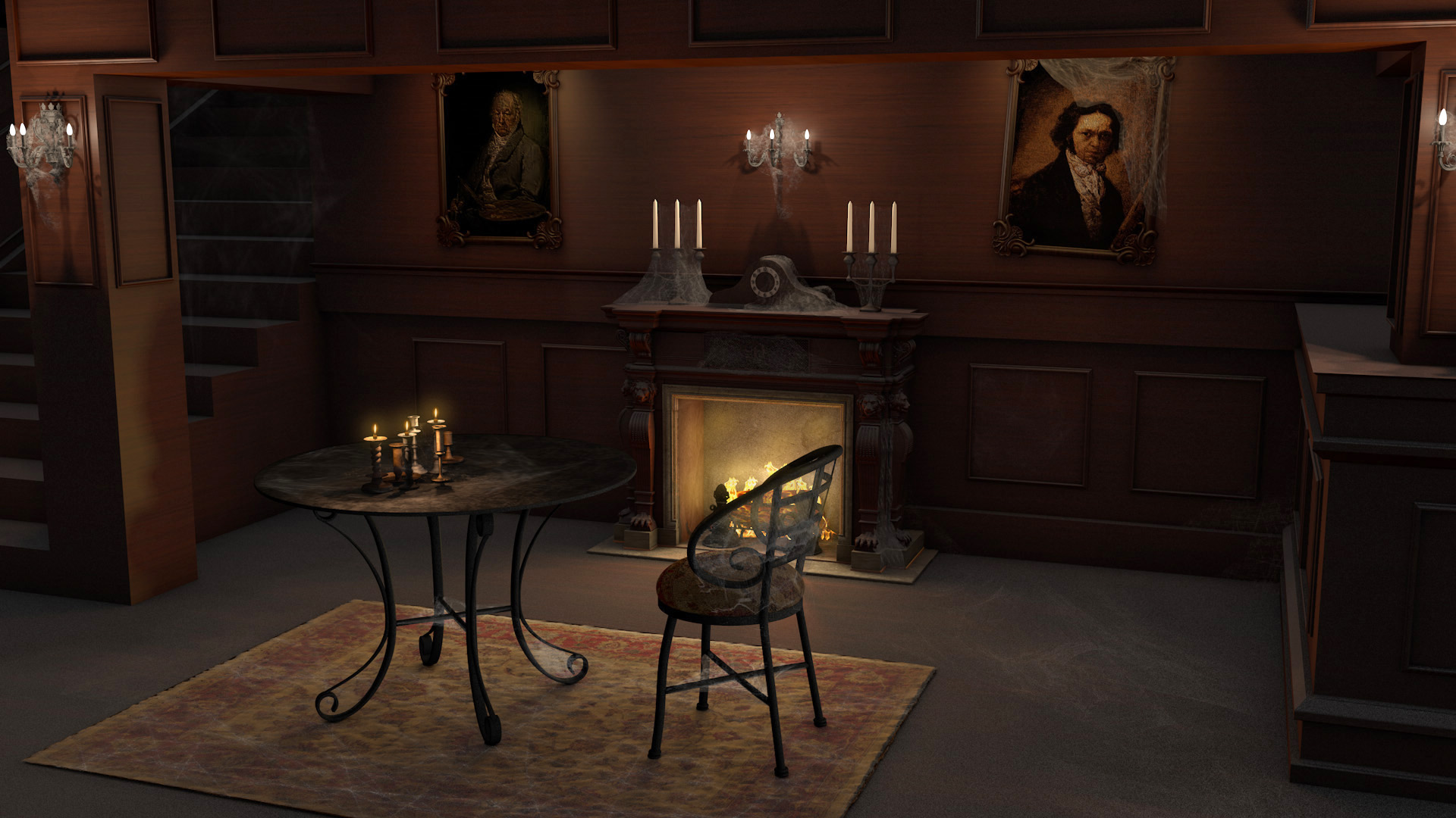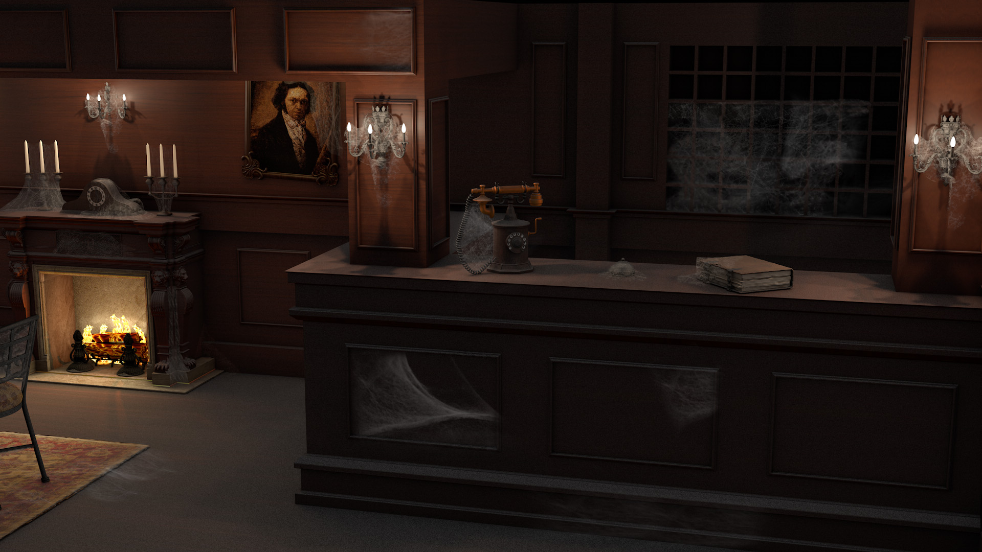 Coincido en que lo que más me gusta de este trabajo es el ambiente que has conseguido. Me gusta el modelado, la iluminación y el cuidado de los detalles, como las telas de araña o el polvo acumulado sobre las superficies. Quizá yo le hubiera dado algo de textura a la madera con un ligero normal map, aunque estaría de más si es melamina.