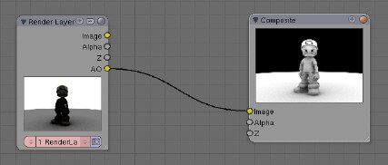Siempre es mejor hacer el render por separado y entonces combinarlo con tu renderizador de imagen, usando el editor Node, o tu programa de edición en 2D favorito. Para renderizar el pase, primero activa Ambient Occlusion en los ajustes de mundo, luego ve a tus ajustes de escena (F10) y asegúrate de que Ray y Do Composite estén activados. También asegúrate de que AO esté activado en la tab Render Layers, haz click en Use Nodes y conecta la salida AO de tu capa renderizada al nodo compositor (Fig.10).
