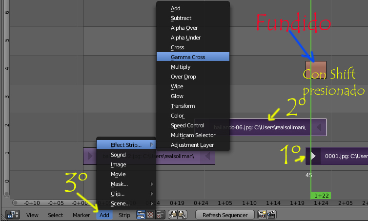 Luego, en el VSE se montan las escenas y si quieres, se le ponen fundidos entre escena y escena.
