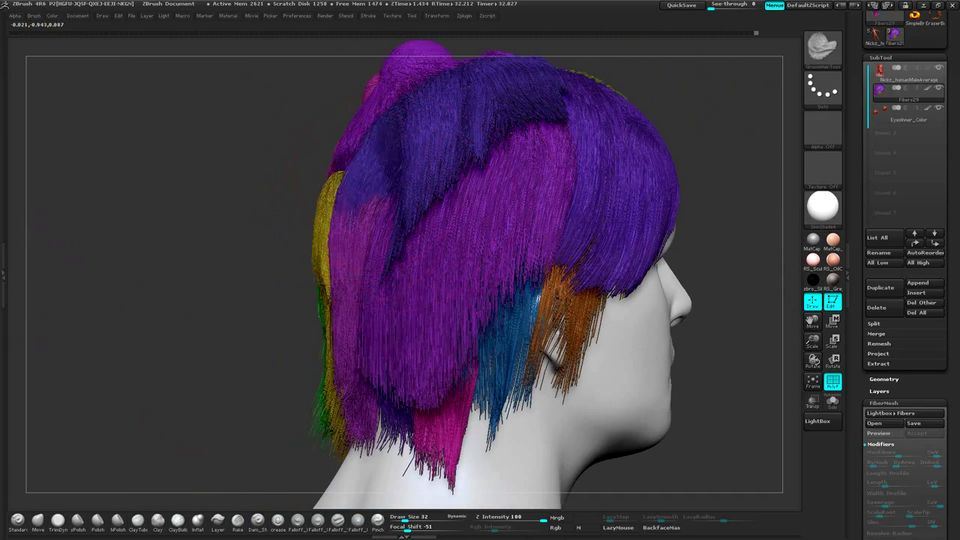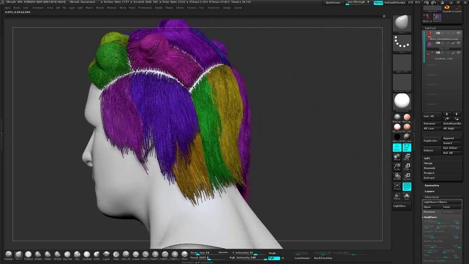 Con ZBrush sus modelos se beneficiaran de tener verdadera geometría esculpida, con pelo y piel exportable. Con esta nueva característica, incluso se puede cultivar plantas, hierbas, arbustos y otros detalles del entorno. Simplemente tienes que enmascarar un área para definir donde crecerán las fibras. Utilice las diversas características Fibermesh para definir una vista previa de forma rápida. Lo mejor de todo, usted puede incluso utilizar la información Polypaint para generar una amplia gama de fibras de color.