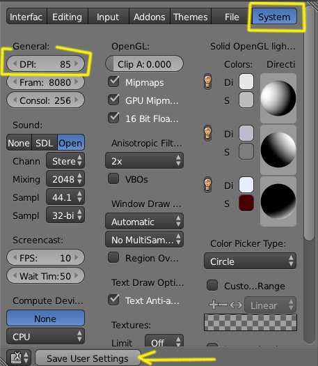 En lo referente a cambios de configuración de teclas, colores y temas de Blender puede salir más caro el collar que el perro. Yo desde que estoy con Blender lo he dejado igual (por defecto), salvo algún pequeño cambio. A la larga los cambios que realices es posible que tengas que revertirlos, incluso que te parezcan otra cosa. Yo estuve un tiempo cambiando colores y demás y me fueron más problemas que otra cosa. Intenta trabajar con lo que hay. Además, todos los videos de la red vienen con la configuración de fabrica y al comenzar con el 3d se nota. Saludos.