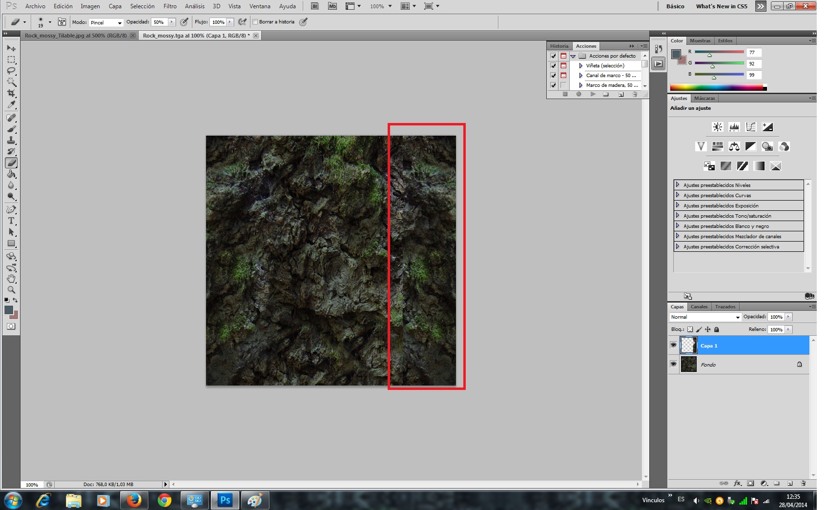 Cortamos un segmento de la parte derecha, hacemos un MIRROR del recorte y la encuadramos en la parte izquierda (los bordes exteriores ya coinciden), luego para disimular el corte entre el recorte y el fondo con la herramienta Erase con un pincel tipo Smooth y opacity al 50% borramos el corte entre las capas hasta qué quede disimulado con el fondo. Y los mismo con el borde superior e inferior de la textura.