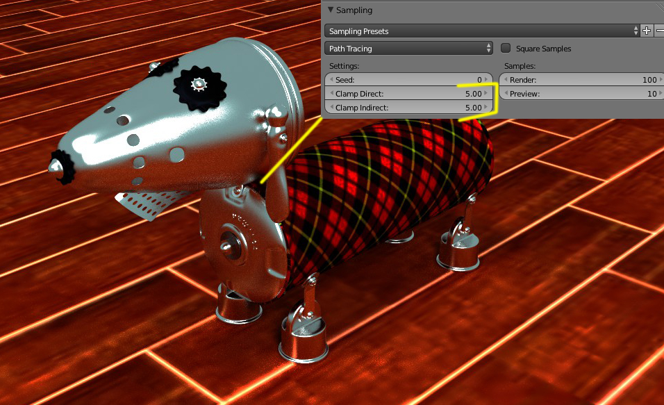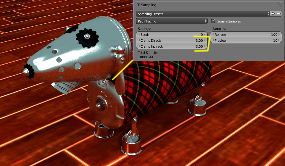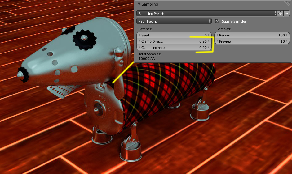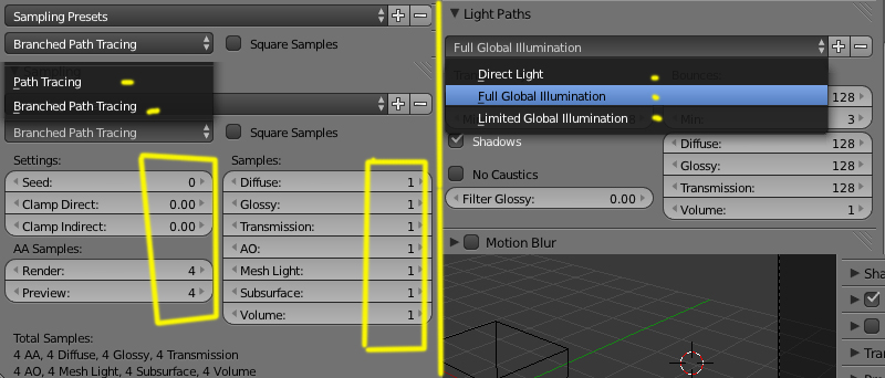 O lo que es lo mismon en imágenes, que puedes probar a cambiar algunos valores de los rebotes de luz, desde los dos paneles de render. El Sampling y el Light Paths.