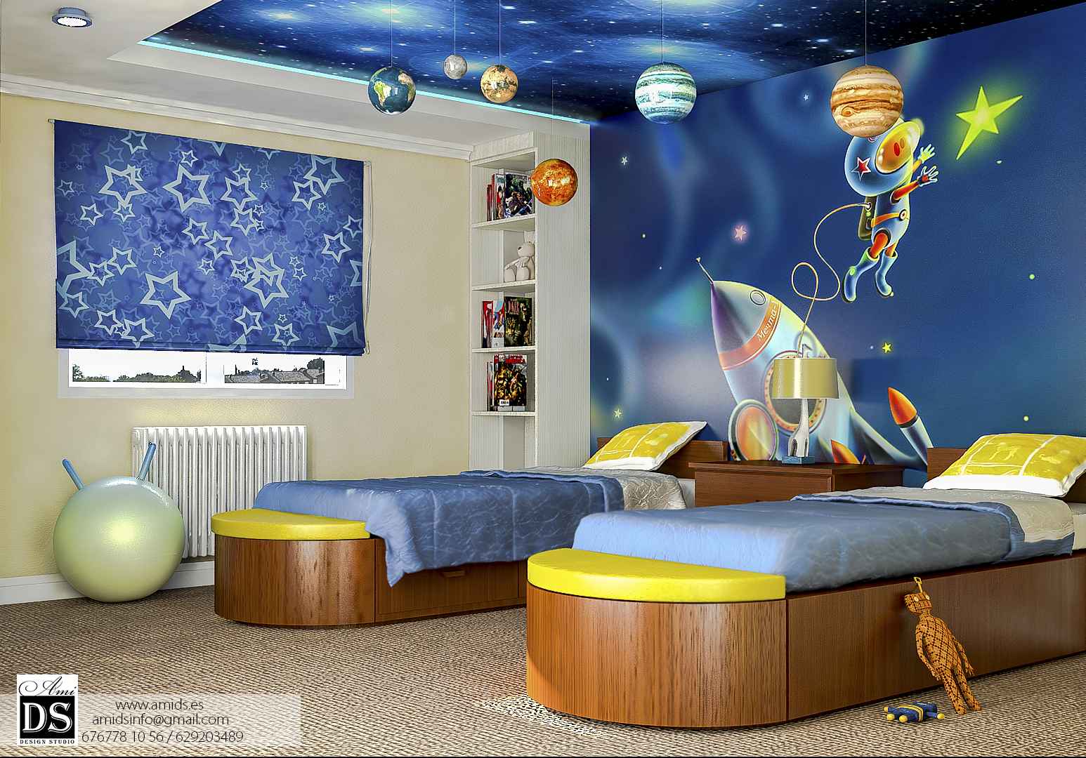 Qué bueno, cualquier niño estaría contento con una habitación así. Corrigiendo algunas cosas se queda un trabajo espectacular. Por ejemplo, el cordel del estor atraviesa la pared, al igual que el edredón de la cama más cercana a la cámara, que en el doblez, en el lateral derecho del colchón, parece que atraviesa la base. El mapeado de la madera de la cama en la curva se ve como más estirado en la cama más lejana y el muñeco que está apoyado en el lateral de la cama se ve muy forzada esa posición, como si pretendieras que se viera y forzaras demasiado la situación, no sé si se me entiende.