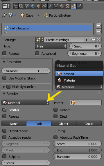 El material de las partículas se indica desde Particles > Render > Material.