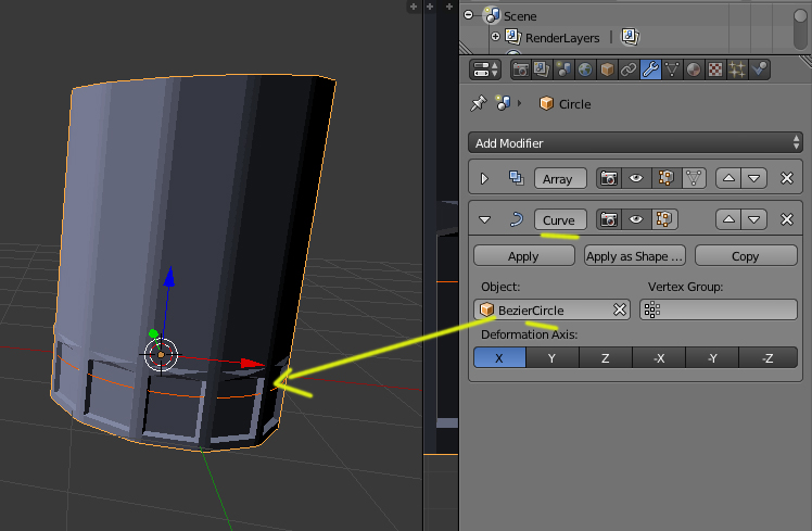 Luego se añade un círculo Bézier y al modelado del vaso se le añade ese modificador de tipo Curve.