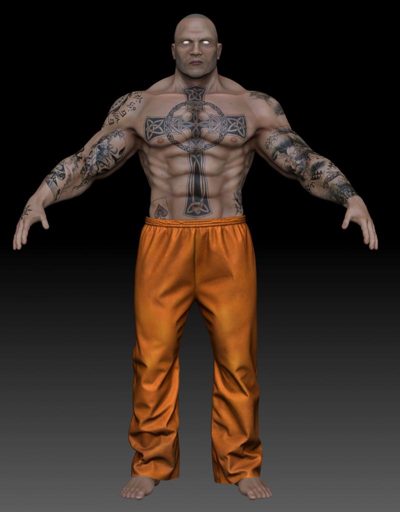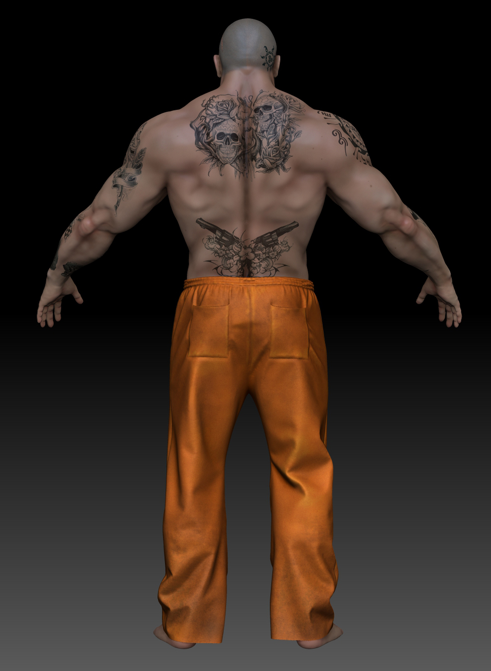 De momento estoy haciendo todo en ZBrush (menos el Unwrap, que lo he hecho en 3dMax). Me imagino que luego llevaré la textura a Adobe Photoshop para ajustar los tonos y demás. E igual ponerle algún tatuaje, porque se me está pasando la idea de hacerle en plan preso con mono naranja, y claro, siendo un preso tendrá que tener tattos.