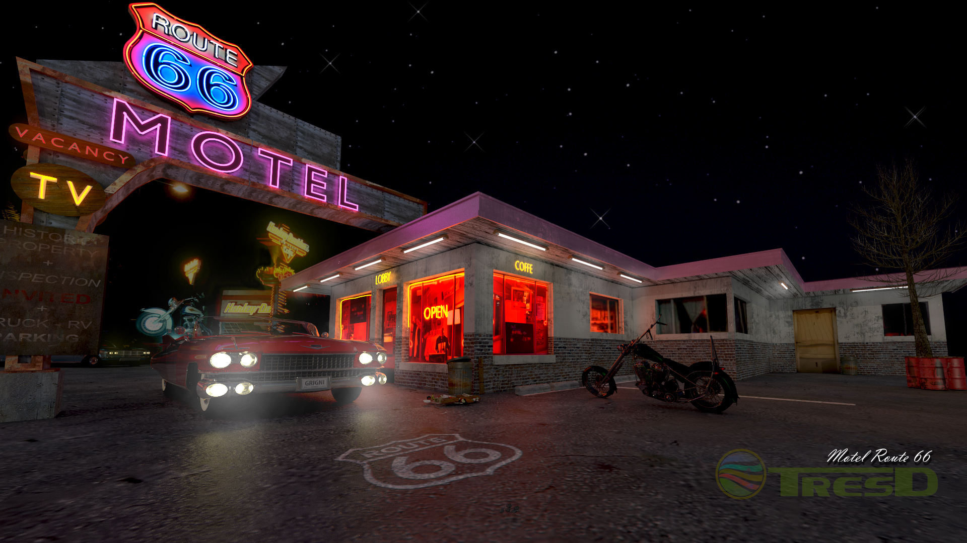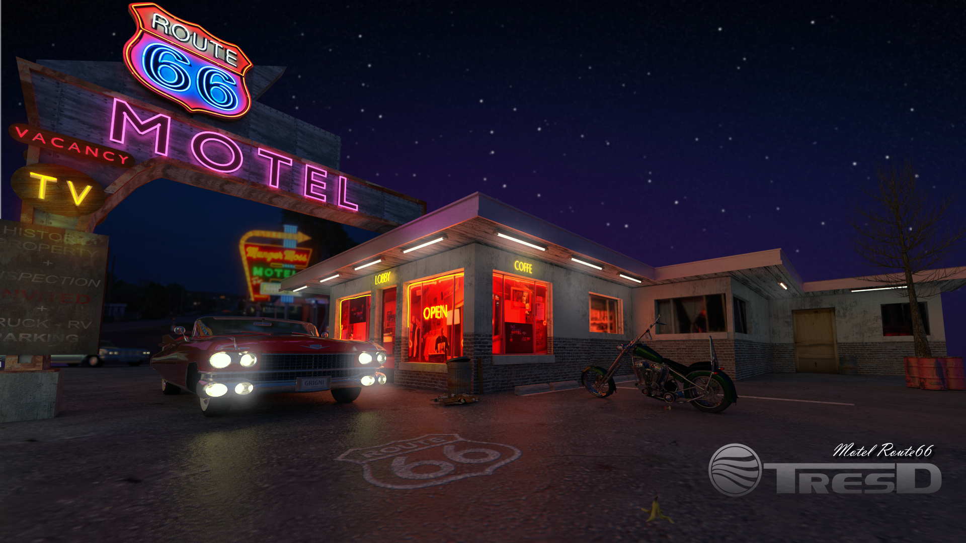 Has sabido plasmar la esencia del tema qué has escogido, es muy americano. Coincido en que la composición y la perspectiva son geniales. Me gusta mucho el neón de La Ruta 66, y también todas las texturas que has utilizado. La idea de que sea una noche al raso también me encanta, así como los colores empleados y su combinación.