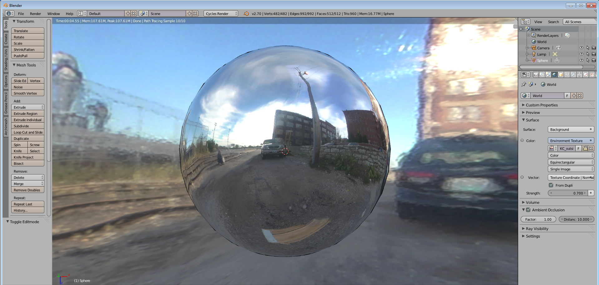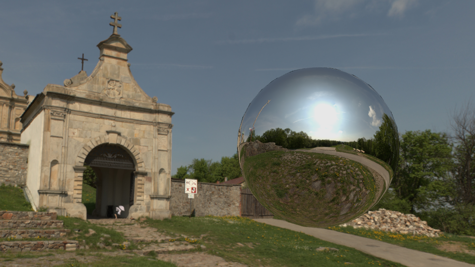 Si miras a la esfera, la imagen se refleja bien, pero si miras por fuera de la esfera, la imagen HDRI se ve expandida y distorsionada. O sea que para colocar esta imagen como imagen de fondo, así como esta no me sirve, es por eso que no sé si se puede ajustar esa distorsión que se genera por fuera.
