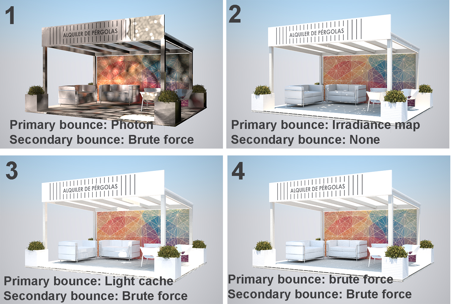 Estoy renderizando unas pérgolas de madera blanca, y cuando le activo el indirect ilumination al render final me salen estos puntitos de luz por todas partes. Primero pensé que era debido a una mesa de cristal que tenía, pero la cambie por esta de madera y sigue pasando. Puede ser por culpa de la lona del techo que es medio transparente?