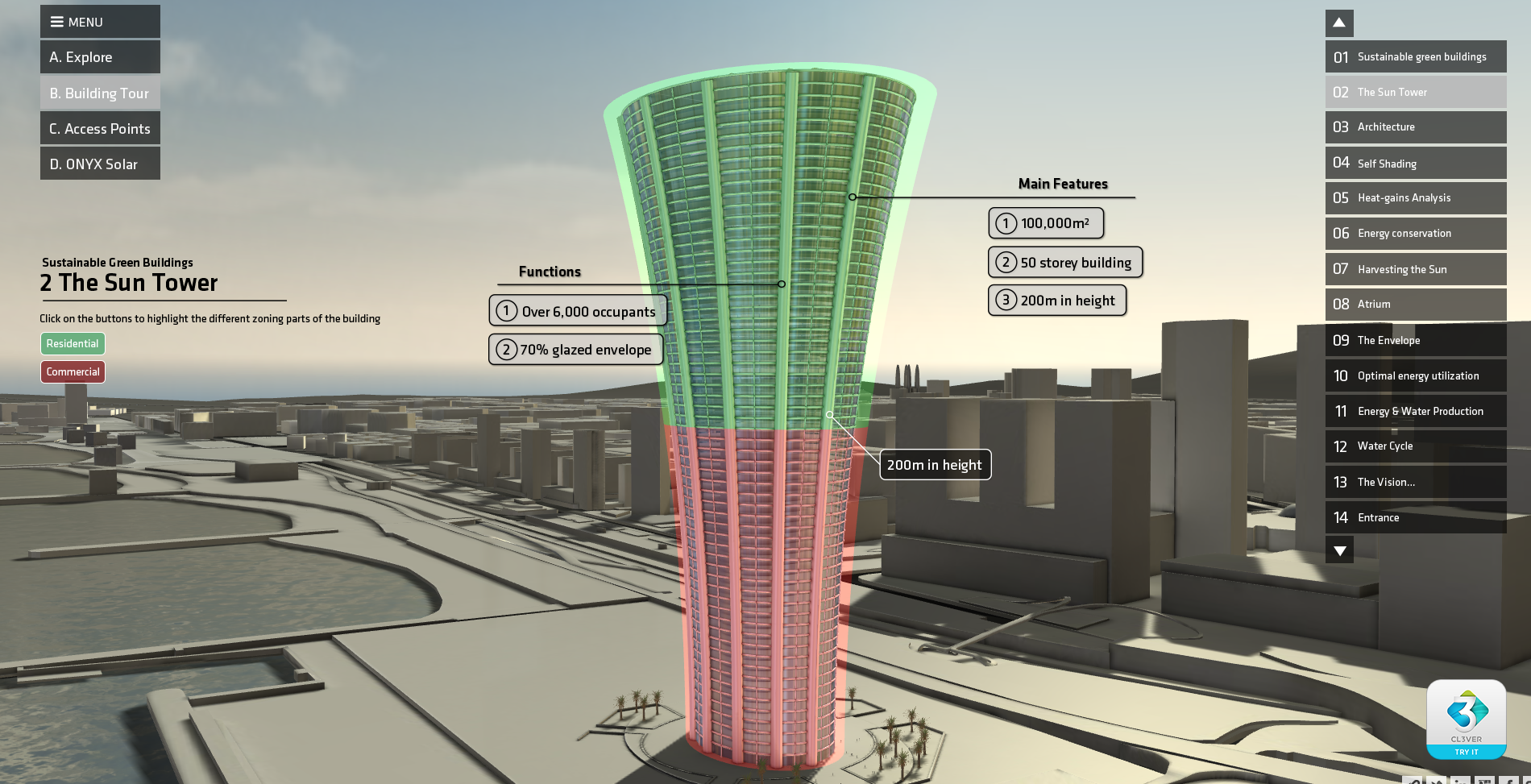 En la misma escena han sido integrados también vídeos e imágenes para qué todos los detalles y particulares del proyecto sean disponibles en la misma página. También se demuestra qué CL3VER es muy flexible según el tamaño del proyecto, desde un tour virtual de un edificio hasta planes urbanos.