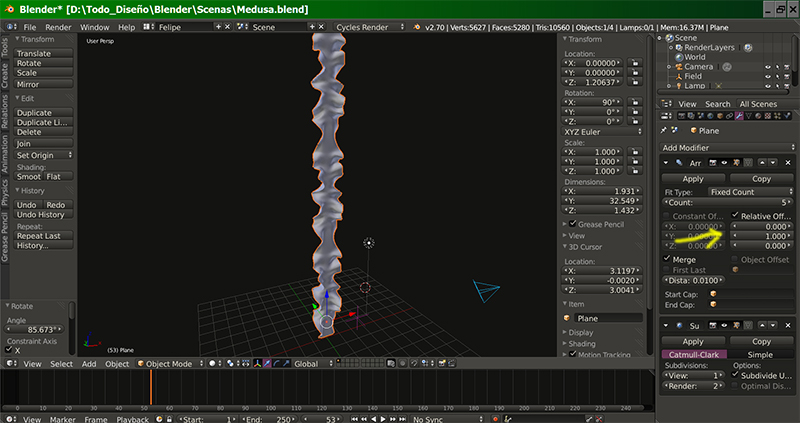 Hola, cómo hago para qué un objeto transformando su rotación, vuelva a poner sus coordenadas como globales. Así al aplicar el array no me encuentro con líos.
