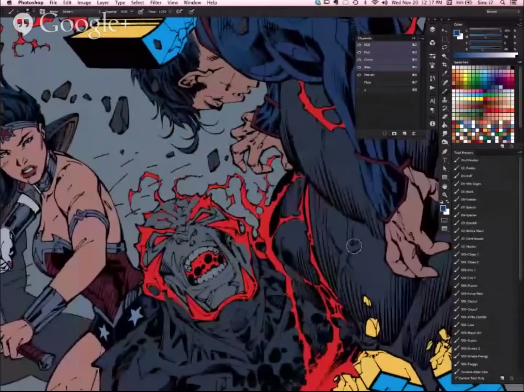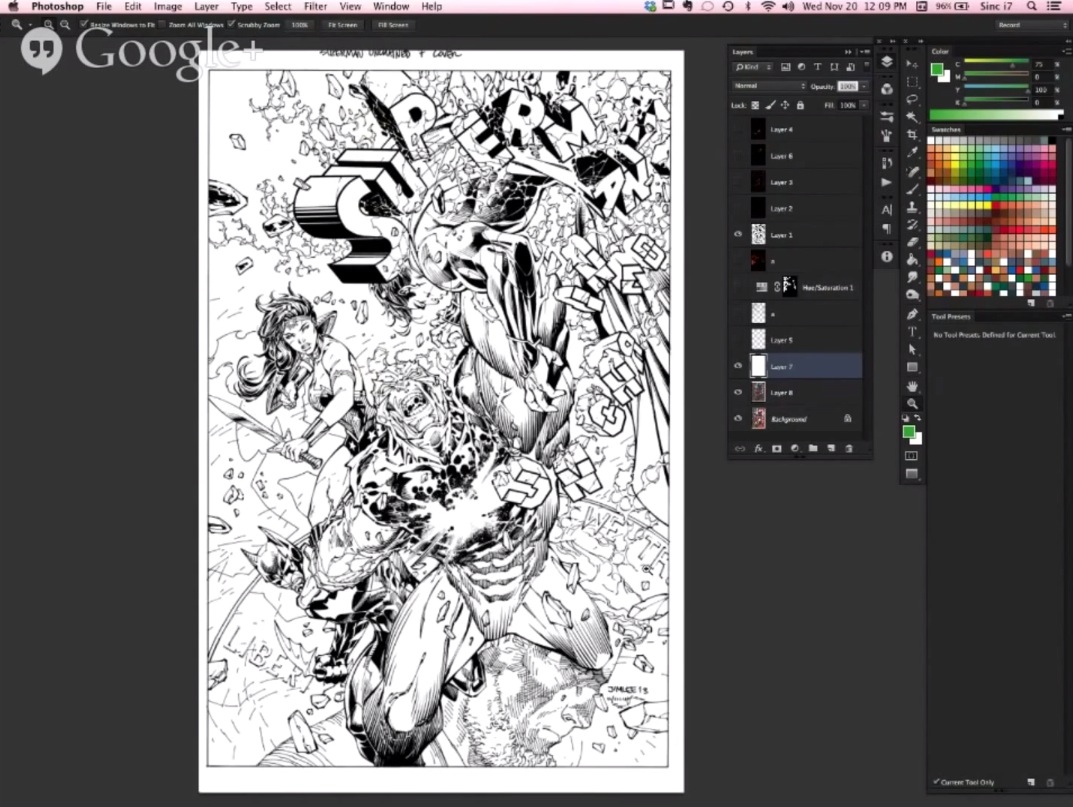 En el siguiente vídeo podemos ver al artista Alex Sinclair compartiendo un proceso de coloración en un portada de Superman, utilizando Adobe Photoshop y una Wacom, Alex Sinclair es colorista desde hace 20 años de los cuales lleva 13 trabajando para DC Cómics, por sus manos han pasado prácticamente todos los personajes de DC.