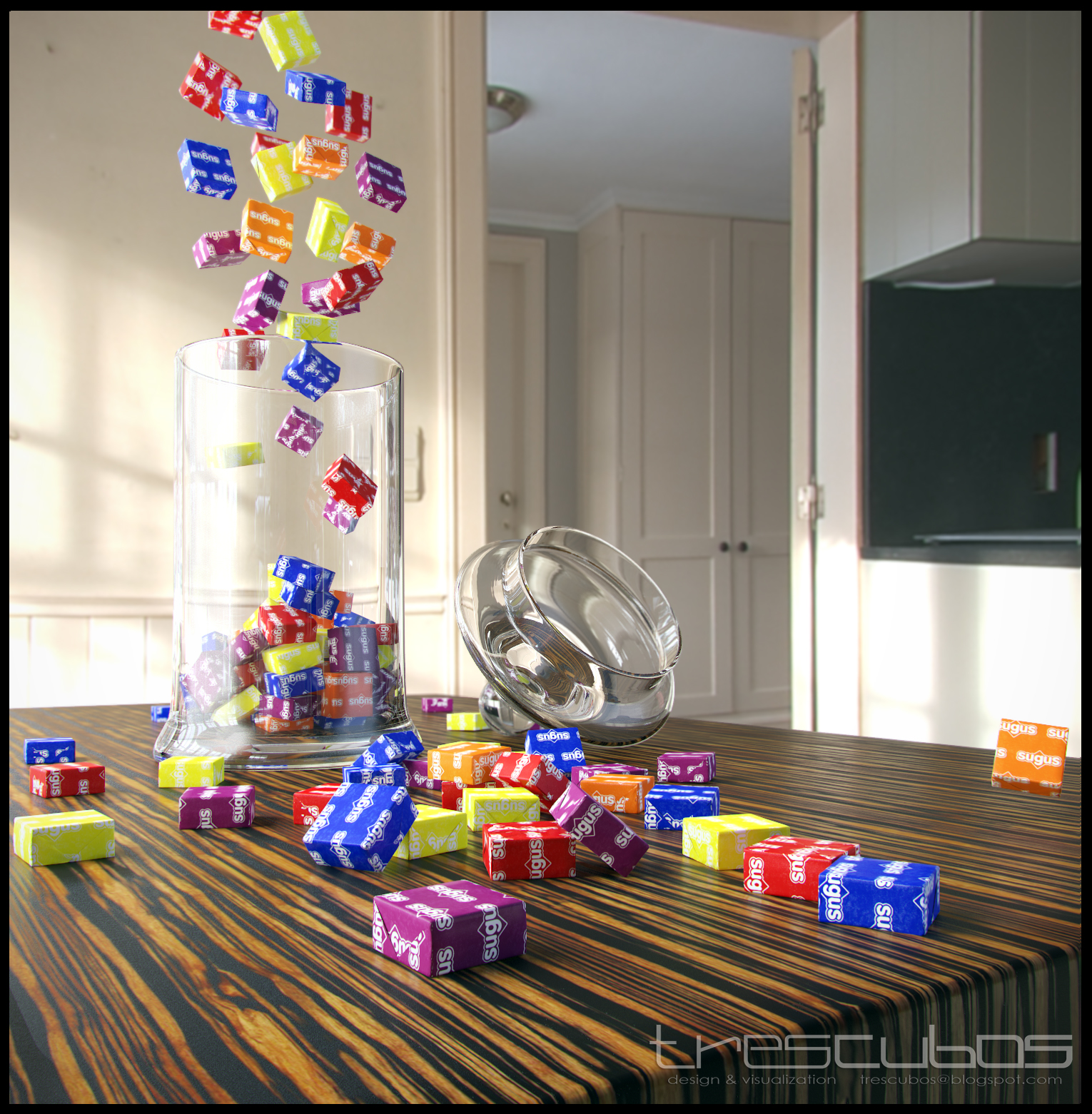 Tanqu3d aquí tienes la preview, com puedes ver tuve problemas con la mayoría de sugus, unos traspasan la mesa, otros se quedan en el aire, pero como al final solo quería sacar un render me daba igual esos fallos.
