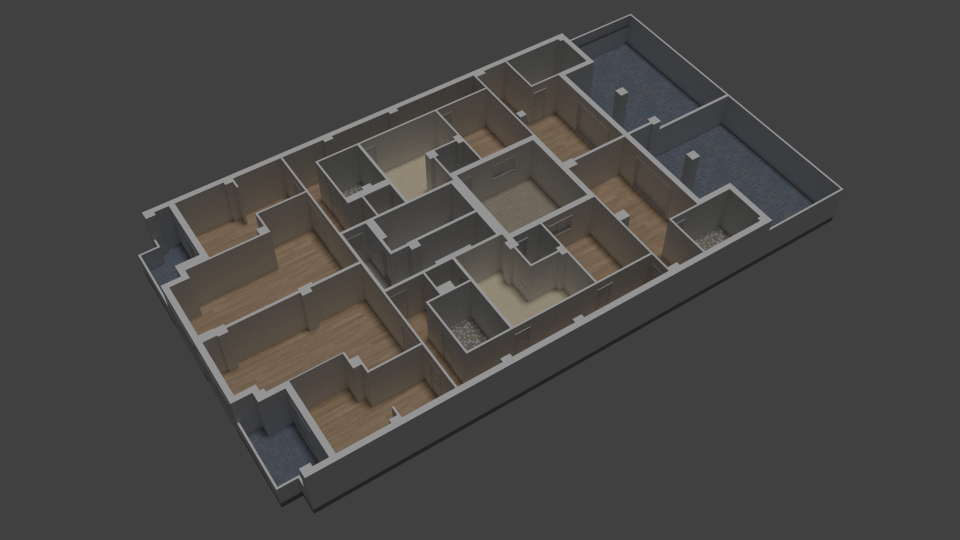 La estructura es así. Quedará como una maqueta. Solo me falta poner todas las texturas y los muebles. Luego subiré renders desde distintos ángulos.