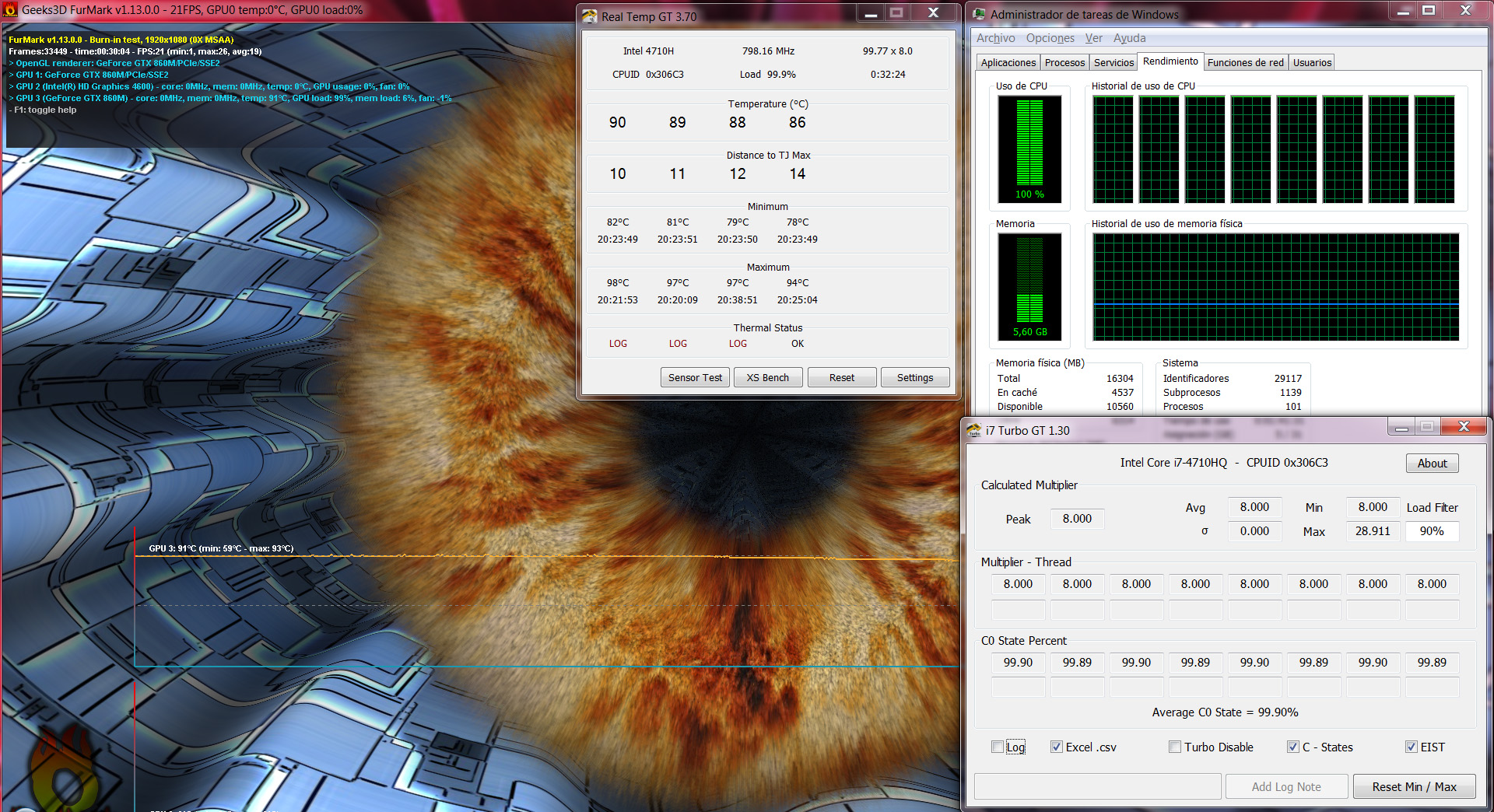 Esta dentro de lo normal, lo que quiere decir que las temperaturas no son malas, pero tampoco excelentes, y es normal ya qué se trata de un portátil. Hay que entender por una parte que el hecho de que los núcleos se pongan a 98º es delicado ya qué están muy cerca de la temperatura máxima qué pueden soportar. Lo bueno es que esto es una prueba algo extrema y en la vida real raramente haremos trabajar tanto el procesador como la gráfica al 100% durante horas, pero si lo hiciéramos los resultados serían muy similares a los que vemos en esa gráfica.