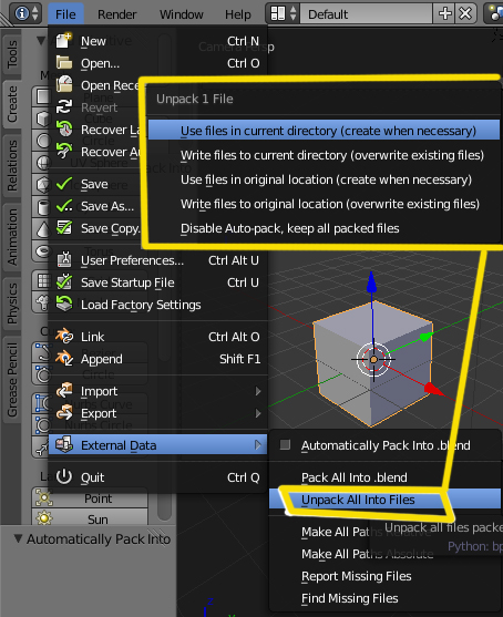 Se me olvidaba, si quieres desempaquetar o hay que modificar la imagen con el Texture Paint, tienes la opción Unpack con diferentes opciones, como creer una carpeta nueva (Texture) donde esempaquetara las imágenes.