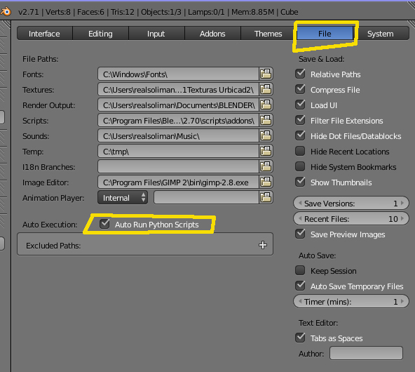 Solo comentar que para los que instalen Blender (por lo menos en Windows) tengan en cuenta de activar el Auto Run Python Scripts desde User Preferencias > FILE.