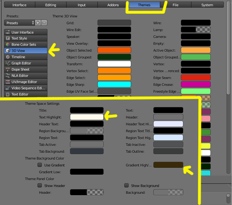 User Preferencias > Themes > 3D View > puedes cambiar el color de fondo y el texto, ETC. (estoy hablando del visor 3d) teniendo en cuenta que si pones un fondo oscuro el texto lo tienes que poner en uno claro.