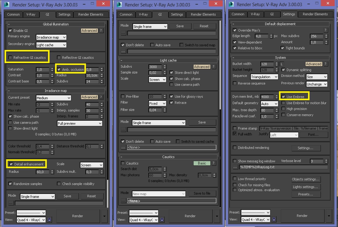 Quería consultar y si es que pueden darme una guía sobre el tema de tiempos de renders y seteos. Si bien hace poco estoy en el mundo del Vray, leí bastante información y consulte muchos tutoriales sobre el tema, pero sigo aún sin dar con la configuración más apropiada para disminuir los tiempos de renders sin perder calidad.-