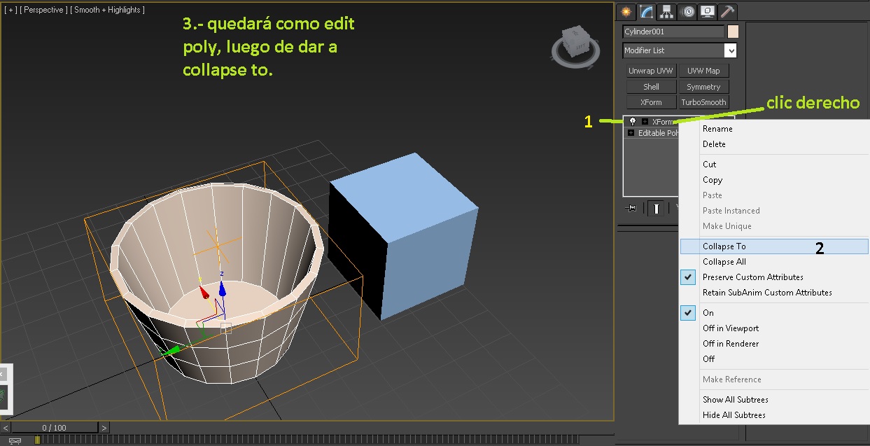 Creación del jarrón con grosor, luego creo un box con dimensiones reales que debería tener mi jarrón como modo de ayuda, y lo posicióno al lado de este, si lo escalo con Scale debo aplicar un reset XForm y luego convertir nuevamente a edit poly. El reset XForm es esencial si la malla sufre muchas modificaciones.