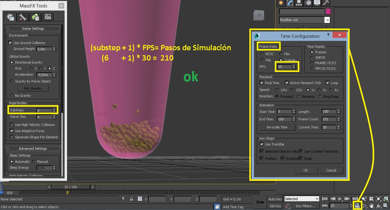 En este ejemplo apliqué lo que traduje. Con 6 substep da una Calidad de 210 pasos en 30 frames, suficiente para qué trabajara apropiadamente y la simulación salió OK.