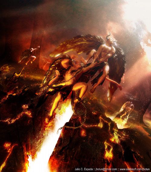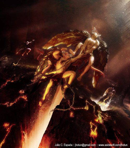 Fijándome en más detalles, acabo de ver que me encanta el Ángel-demonio del fondo a la izquierda, perseguido por esas manos que salen de la lava. Lo que también me ha llevado a darme cuenta que todos los ángeles-demonios están más o menos en la misma posición y vendría bien que la variaras.