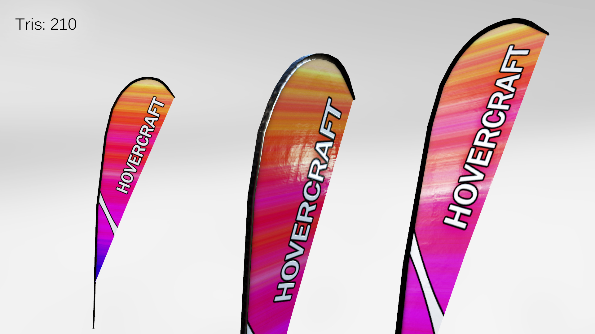 Hay que tener en cuenta que no se va a parar uno a mirarla puesto que vas a pasar rápido así que, el palo puede ser un cilindro de tres caras o cuatro como mucho. La tela tiene que verse por los dos lados, es decir, serían dos polígonos iguales muy juntos uno mirando para cada lado (no voy a usar Shader a dos caras).