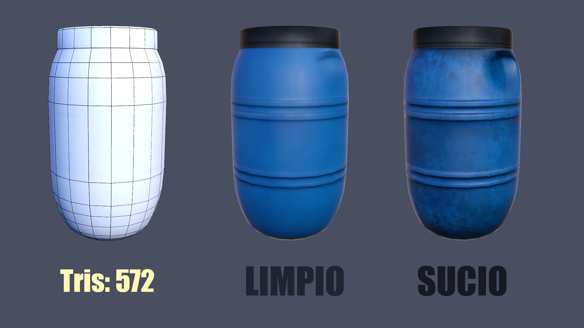 Te paso el barril de plástico, 572 tris. Dos diffuses, uno con el bidón limpio y otro con el bidón sucio, specular y normal.