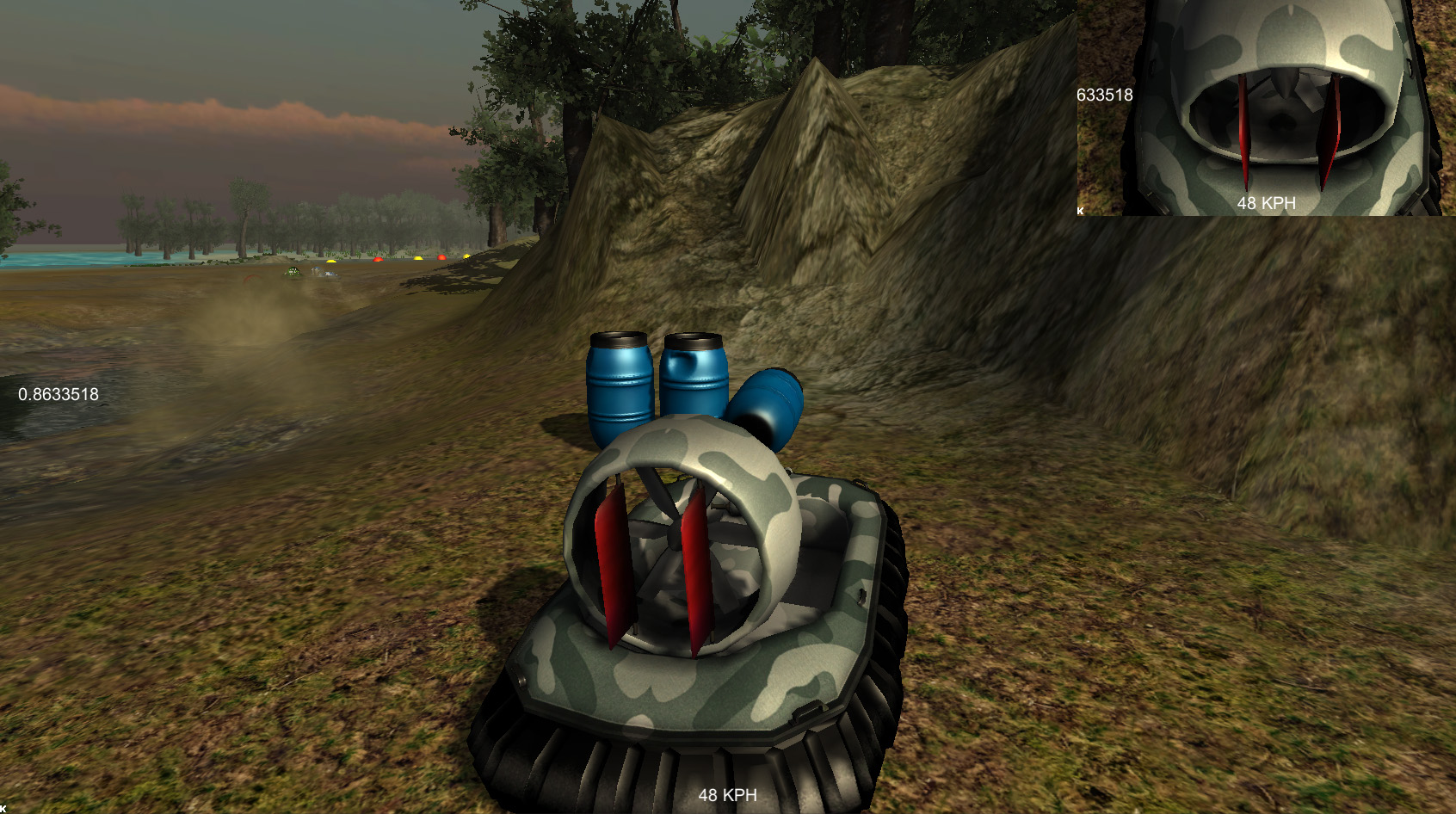 Para empezar haremos una pista de prácticas muy sencilla, terreno y agua con algún desnivel y el manejo de un hovercraft sobre esta. Si alcanzamos esta meta ya será un logro.