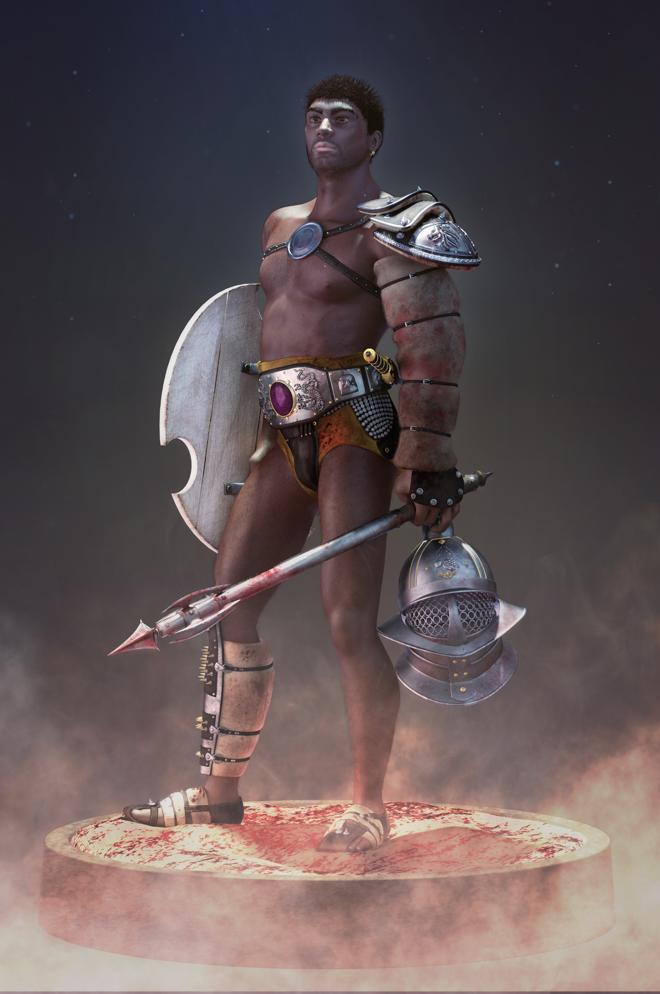 Me encanta el trabajo de modelado, cómo se ha trabajado la malla, su texturización, se denota qué es un rigging perfecto. Para añadir me encantaron las hombreras y las espinilleras. La textura de la sangre es convincente, como después de una gran batalla. En cambio, bueno, para diseño de videojuego pienso que está muy bien, pero en ilustración quiero decir que no me parece muy convincente esa expresión (muy inexpresiva) para un hombre fatigado por la lucha, sangriento y en esa pose. Pienso que el rostro en sí, sólo cambiando con un morph la expresión cambiaría mucho, pero el resto para mí perfecto, es más, impecable. Un saludo.