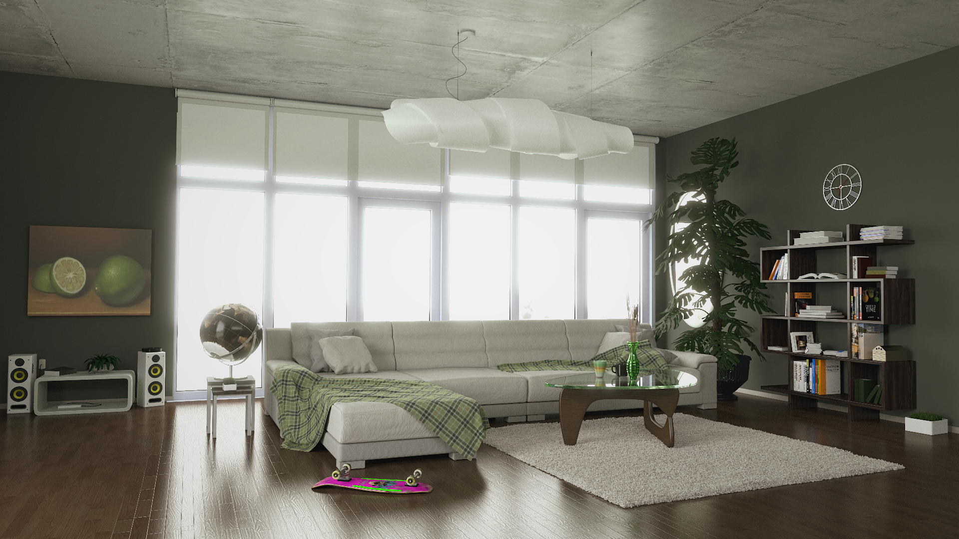 En general, para mí, muy buen trabajo. Corroboro lo que han dicho por arriba, que los cojines parecen azúcarillos. Luego, para ser quisquillosos, pues en la estantería hay un par de libros, que si fuesen reales pesarían cada uno unos cuantos kilos, sobre todo el que está debajo del otro. Le bajaría la saturación al monopatín. Esta bien, pero mejor no arriesgar demasiado y bajarle un poco esos colores, pero solo un pelín.