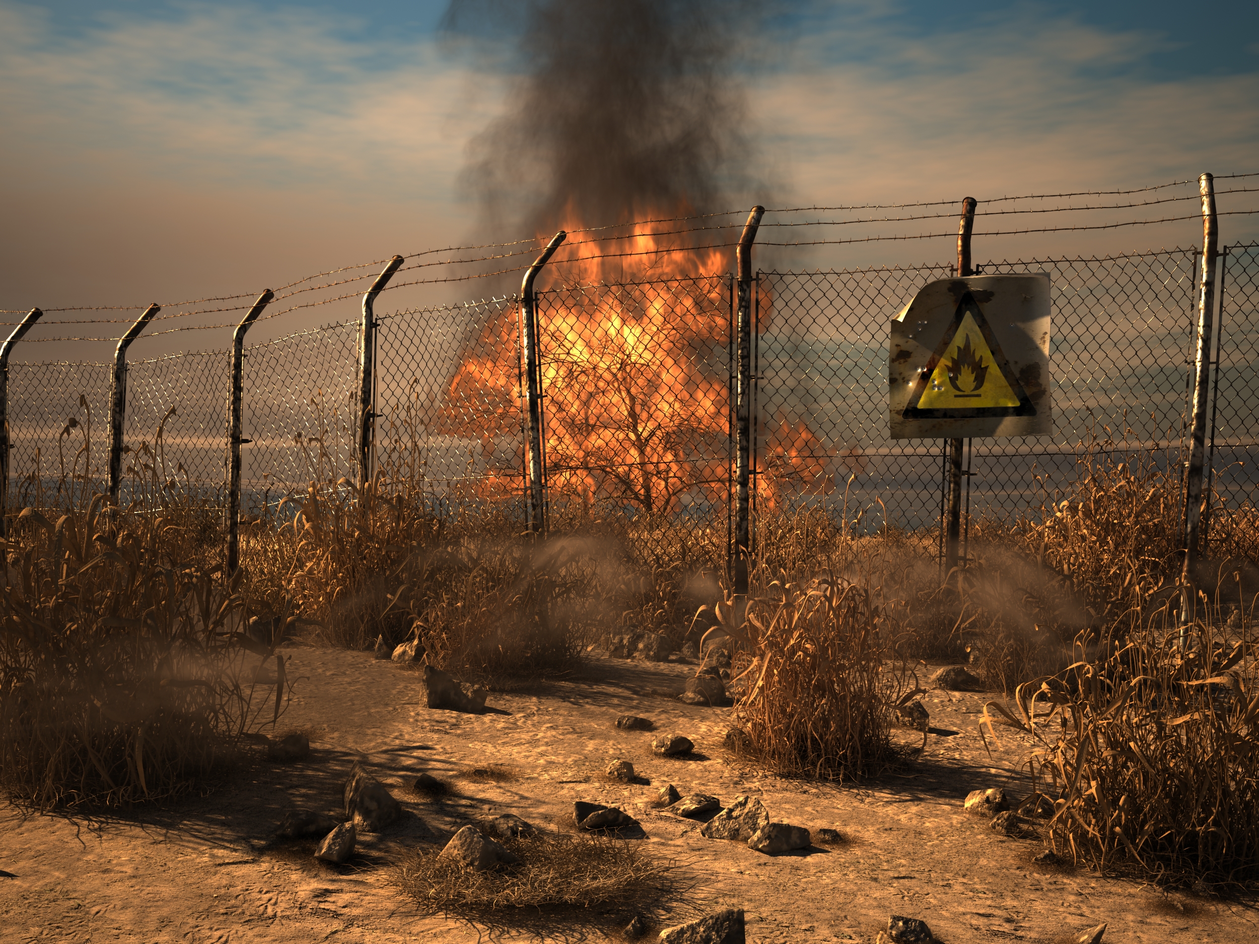 Pues me gusta más ese primer render porque el tono general de la imagen es más anaranjado, acorde con el fuego que se está produciendo. Da más sensación de estar metido dentro de la escena, con ese clima de incendio.