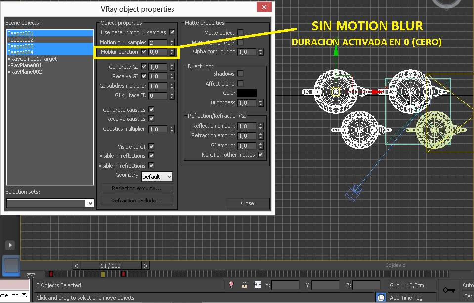 Hola, debes elegir un objeto de tu escena, cualquiera, por ejemplo, el helicóptero. Das clic derecho del mouse y clic a V-Ray properties, ahora debes elegir todos los objetos que no quieres que se vean afectados por el Motion Blur, por último activar moblur duration y dejarlo en 0.