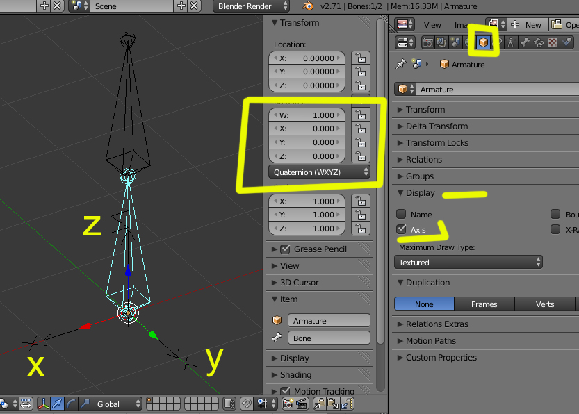 Luego en el panel de Properties en la opción Transfor, prueba a ir girando los diferentes ejes, así veras cual giro corresponde a cada movimiento.