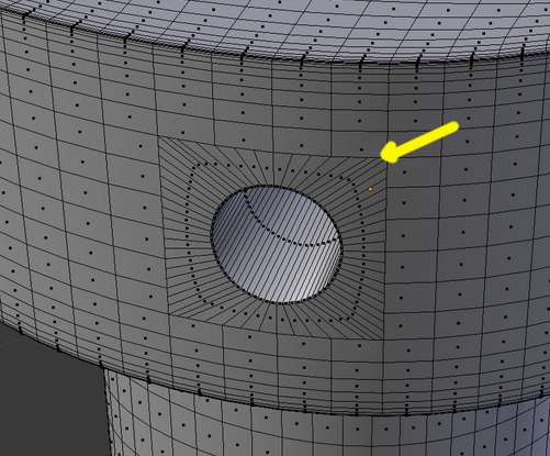 He realizado una proyección de la circunsferencia para que se adapte a la superficie del objeto de mayor tamaño. Como apliqué el modificador de subdivisión de superficie en esta figura, tuve que hacer lo mismo con la circunsferencia. El método ha sido bueno, pero como pueden ver me salen sombras y al final término con una malla compleja, cosa que no me gusta: