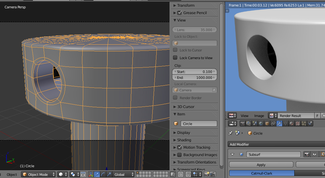 En un principio intentaba hacerlo mediante subdivisión, pero cómo puedes ver en mí último video, la figura se deforma de manera no deseada por lo que intenté hacerlo aplicando el modificador de subdivisión antes de hacer el orificio.